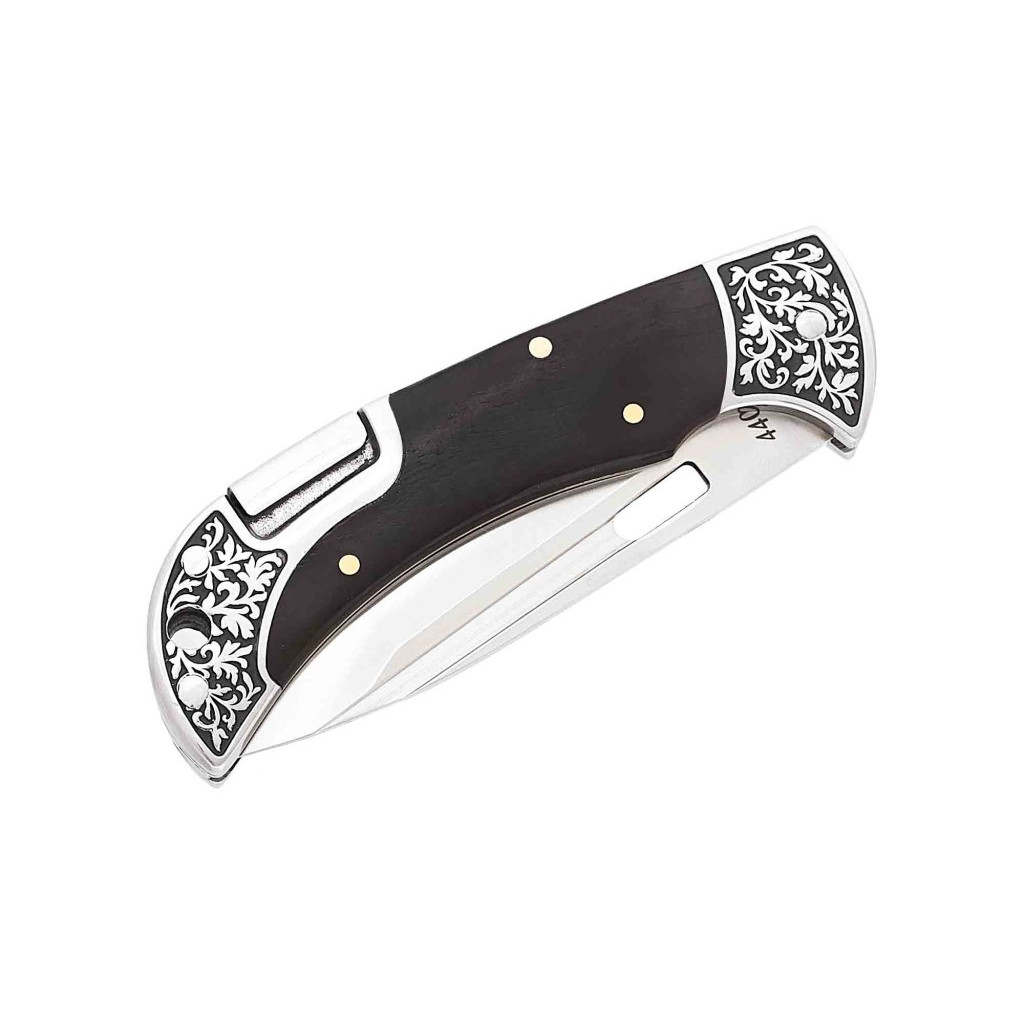Рукоять ножа – настоящая классика. Стальной корпус с приклепаными деревянными накладками и стальными притинами. Прибор ножа покрыт растительным орнаментом в духе украшений охотничьего снаряжения. Рукоять, благодаря эргономичным выборкам очень удобна и надёжно держит руку. Нож дарит ладони ощущение приятной увесистости и удобства.