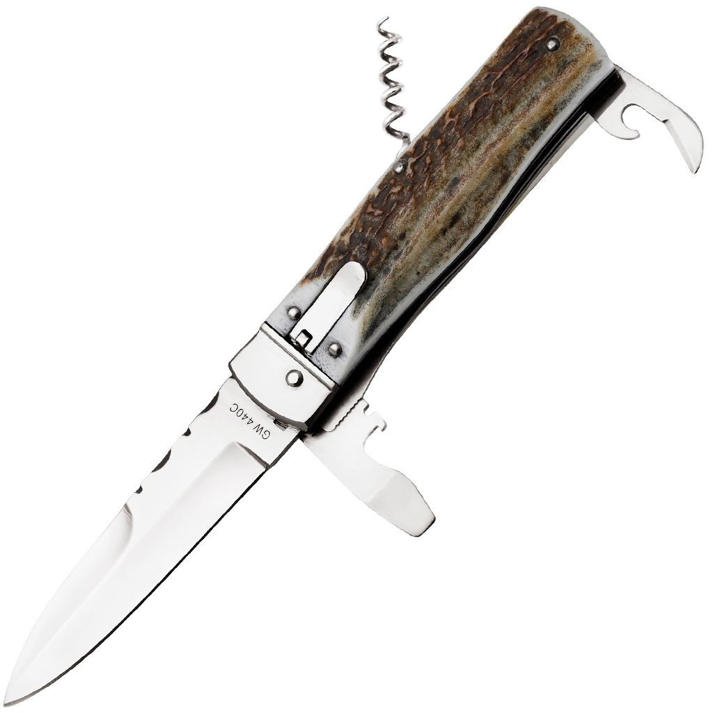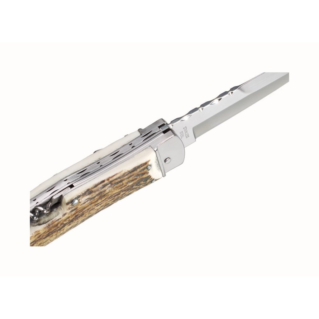 До цього ножа підходить ЧЕХОЛ- XXL (КОРИЧНИЙ) -A underline;">ЧЕХОЛ- XXL (ЧОРН) -A викидний ніж, оснащений механізмом типу прапорця. Цей гарний ніж прикрашений практичними накладками з натурального рогу та забезпечений надійним клинком.